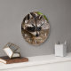 Une horloge avec la photo d'un joli et curieux raton laveur reposant son visage sur un rondelle en bois. Adorable.