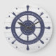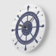 Horloge murale à thème maritime, avec des graphiques de la roue d'un navire bleu et des points bleus pour les chiffres, sur un look de bois lavé blanc. Idéal à bord ou dans votre chalet de plage.