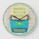 Ce joli design d'horloge murale pour écrivains créatifs / romanciers / journalistes et toute autre sorte d'auteur a une jolie machine à écrire bleu aqua en tirant dessus. La machine à écrire de style vintage des années 60 a un coeur au milieu et son papier dit, "[Votre nom]'s Writing Room." L'arrière - plan a un stylo à encre légère qui répète le motif avec une aquarelle / effet peint. C'est une mignonne horloge murale moderne et rétro qui aura l'air belle sur le mur de n'importe quel bureau d'écrivain passionné. Indiquez l'heure avec le cercle bleu-vert turquoise autour de l'extérieur du design.