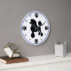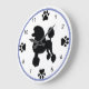 Une horloge amoureux des chiens avec la silhouette d'un caniche standard, avec des empreintes de pattes marquant les quartiers.