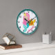 Une horloge murale mignonne de sirène qui peut être personnalisée avec le nom d'un enfant, une addition parfaite à une chambre à coucher de petite fille, la crèche de bébé ou ferait un cadeau idéal de baby shower. Les caractéristiques de conception une petite sirène rose-haired adorable avec la queue bleue posant avec son poisson rouge d'animal familier.
