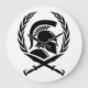 Silhouette of spartan helmet and shoulders with two crossed swords and wreath surrounding helmet.