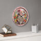 This charming round wall clock features a whimsical 3D-style digital illustration of a cheerful garden gnome. The gnome, sporting a long white beard and a tall pink hat adorned with a checkered bow and colorful blossoms, holds a rustic wooden sign that reads "WELCOME FRIENDS." The scene is nestled within a lush frame of sculpted flowers in vibrant shades of pink, yellow, blue, and purple, accompanied by a delicate butterfly. The background consists of light-colored wood planks, while the outer rim of the clock features a stylish pink and white gingham check pattern with elegant numeric markers. This functional home decor piece is a perfect addition to entryways, kitchens, or sunrooms, serving as a warm greeting for guests. It makes a delightful housewarming gift or seasonal accent for anyone who loves folklore and garden-themed art.