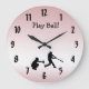 This pretty pink baseball clock presents a catcher and batter in black silhouette and the text: Play Ball. Easily personalize or remove the text. Add your own player or team !