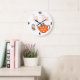 Stylish kitchen wall clock, with graphics of a tea bag and a orange and white polka dot tea pot. Tea Time in whimsical orange text, at the top is fully customizable to read what you want. Numbers are done en black. Cute looking clock that add a great accent to your kitchen.