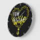 Cette horloge murale est un hommage affectueux à la femme d'un chauffeur de camion de remorque. Il présente une forme de coeur faite de chaînes dorées, avec les mots "TOW Wife" clairement affiché au centre dans une police jaune assortie. L'horloge a un arrière - plan noir élégant et une jante blanche, créant un contraste visuel saisissant. Vous pouvez customiser la couleur du cadre à n'importe quelle couleur que vous désirez en entrant dans l'outil de conception.