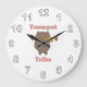 Do you like cute clocks? This clock features a brown cat playing the trumpet and the words trumpet tribe in pink. It also includes white numbers with a black outline.