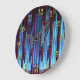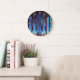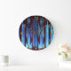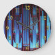 Un orgue à pipe est allumé pour un concert avec un éclairage bleu, qui contraste avec les structures en bois rouge du boîtier qui tient les tuyaux. L'orgue présenté montre de petites et grandes pipes de la façade de l'orgue de l'hôtel de ville à Christchurch, en Nouvelle-Zélande. Les numéros de l'horloge sont de couleur jaune et sont dans la police Curlz amusante.