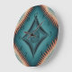 Un design motif géométrique symétrique au format carré avec un jeu de couleurs turquoise et cuivre. Le centre comprend un grand médaillon en forme de losange avec un travail en ligne complexe et un motif de sunburst circulaire à l'intérieur. Le médaillon est entouré de quatre petits cadres en forme de losange avec des motifs de bordure ornés. L'arrière - plan a un effet de sunburst rayonnant émanant du centre, créant un sens dynamique du mouvement. La bordure extérieure est constituée de pointes en cuivre, en forme de dent, déchiquetées contre l'arrière - plan turquoise. L'ensemble est entouré d'une fine bordure en pointillés. La palette de couleurs passe du turquoise profond au centre à des tons turquoise plus clairs près des bords, avec des accents de cuivre dans les pointes et les éléments décoratifs. Le motif a une influence de conception amérindienne ou du sud-ouest avec ses formes géométriques et ses motifs rayonnants.