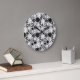 Two images show a round wall clock with a black and white pattern of various clock faces and gears. The first image is a front view; the second shows an angled view.