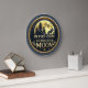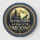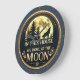 Ce panneau rond et encadré de bronze présente le texte en gras et métallique "DANS CETTE MAISON NOUS REPOUSSONS SUR LA LUNE". Dans l'arrière - plan, une silhouette de loup hurle à une grande et pleine lune au-dessus d'une forêt de pins. L'art est très sombre, capricieux et un peu gothique, parfait pour une décoration décalée.