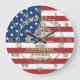 The clock face features the bold and recognizable design of the American flag, with vibrant red and white stripes and a deep blue field filled with stars forming a powerful patriotic backdrop. Surrounding the design are elegant gold Roman numerals that bring a timeless and classic look while making the clock easy to read from any distance.