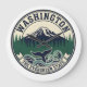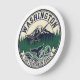 Celebrate the rugged beauty of the Pacific Northwest with this stunning circular emblem. Featuring the iconic snow-capped peak of Mt. Rainier rising above a lush evergreen forest, this design perfectly captures the spirit of The Evergreen State