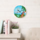 Illustration numérique d'une plage tropicale avec un perroquet macaw perché sur une guitare et un hydravion Albatross dans la baie.