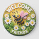 This delightful round wall clock features a charming 3D-style digital illustration of a cheerful honey bee with rosy cheeks and pink wings. The bee is surrounded by a lush arrangement of white daisies and vibrant green leaves against a sunny yellow and green background. Bold white lettering at the top reads "WELCOME," while a matching banner at the bottom displays the word "FRIENDS," creating a warm and inviting atmosphere. The textured, clay-like appearance of the characters and floral elements adds a unique depth and artisanal feel to the design. This functional home accessory is a perfect decorative piece for kitchens, entryways, or as a thoughtful housewarming gift. Its bright color palette and friendly greeting provide a joyful and welcoming focal point for any interior space, celebrating the beauty of nature and friendship.
