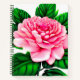 Journal dans une grande photo closeup d'une fleur de pivoine, dans les tons rose pastel à rose corail moyen, avec feuilles vert émeraude
