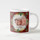 "1er Noël en Grand-Mère Photo Holly Pine Cone Géant Café Mug." Précieux cadeau de conservation pour la nouvelle grand-mère au trésor éternel. Vous y trouverez une photo de votre petit-enfant et votre message personnalisé avec le nom du bébé. Tout l'art a été peint en aquarelle par Audrey Jeanne Roberts, artiste et designer de renommée internationale, copyright.
