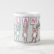 De mignons lapins sur une tasse à café. Fun Rabbit Design personnalisé Mug pour quelqu'un avec un nom de 7 lettres. Fun rose et blanc Mug avec l'illustration de lapins en rose et bleu. Les lapins tiennent des cartes pour épeler le nom.
