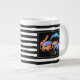 Une tasse à café avec un motif rayé noir dans l'arrière - plan. Un rectangle noir avec une bordure crème est disposé sur le dessus. A l'intérieur est une aquarelle numérique d'un troupeau d'animaux sauvages qui courent ensemble. Les animaux comprennent un dauphin saut, une girafe, un éléphant, un kangourou, un rhinocéros, un lion et un léopard. Personnalisez avec un nom.