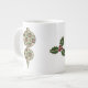 Quatre carrés en vert et bronzé sont ornés de rouge décoré de flocons de neige blancs et de houx vert aux baies rouges. La couture blanche ajoute une touche décorative, donnant au motif répétitif l'aspect d'une courtepointe, créant une sensation de douceur pour les vacances de Noël. La forme d'un ornement en larme crée un masque pour le design pour ajouter une touche saisonnière finale. Cette tasse est disponible en jumbo, espresso, et la porcelaine osseuse tailles et styles.