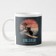 Chat Sunset Wave-Riding Grande Mug Café : Un chat noir surfant sur une vague, avec le coucher de soleil dans les tons rose et orange, créant une scène fantasque et surréaliste.