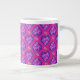 Un joli café Jumbo ou Mug à soupe avec un motif de coeurs et de fleurs dans les tons magenta, rose, violet et bleu.