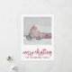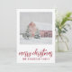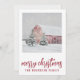 Simple grange rouge sous la neige hivernale carte de Noël. Ajoutez le nom de votre famille. Style campagne.