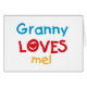 Granny Loves Me T-shirts, cartes, autocollants, sacs de carrosserie, et plus avec coloré rouge, jaune, et bleu texte et conception du coeur. Ces vêtements et cadeaux Granny Love me feront sourire grand-mère!