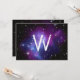 Une invitation vide prête pour votre texte personnalisé. Il y a une seule lettre personnalisable monogramme blanc sur un côté. L'image spatiale est composée d'une grappe de galaxies bleues et violettes MACS J0717 grâce au programme de la NASA et de Hubble.