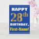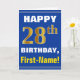 Ce simple design de carte de voeux sur le thème de l'anniversaire présente un voeu d'anniversaire chaleureux comme "HEUREUX 28ème anniversaire, prénom!" sur le devant, en texte gras sur un arrière - plan de couleur bleue. Le numéro d'anniversaire a un look de couleur imitation or. Le nom sur le devant peut être personnalisé. L'intérieur comporte un message d'anniversaire qui peut être personnalisé. Une carte de voeux comme celle-ci pourrait être une façon amusante d'offrir des voeux d'anniversaire à quelqu'un qui célèbre son vingt-huitième anniversaire. [~Z0000278]