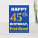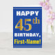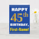 Ce simple design de carte de voeux sur le thème de l'anniversaire présente un voeu d'anniversaire chaleureux comme "HEUREUX 45ème anniversaire, prénom!" sur le devant, en texte gras sur un arrière - plan de couleur bleue. Le numéro d'anniversaire a une apparence de coloration fausse/imitation or. Le nom sur le devant peut être customisé. L'intérieur comporte un message d'anniversaire qui peut être personnalisé. Une carte de voeux comme celle-ci pourrait être une façon amusante d'offrir des voeux d'anniversaire à quelqu'un qui célèbre son quarante-cinquième anniversaire. [~Z0000278]