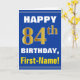 Ce simple design de carte de voeux sur le thème de l'anniversaire présente un voeu d'anniversaire chaleureux comme "HAPPY 84th BIRTHDAY, First-Name!" sur le devant, en texte gras sur un arrière - plan de couleur bleue. Le numéro d'anniversaire a une apparence de coloration fausse/imitation or. Le nom sur le devant peut être customisé. L'intérieur comporte un message d'anniversaire qui peut être customisé. Une carte de voeux comme celle-ci pourrait être une façon amusante d'offrir des voeux d'anniversaire à quelqu'un qui célèbre son quatre-vingt-quatrième anniversaire. [~Z0000278]