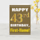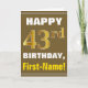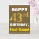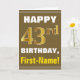 Ce simple design de carte de voeux sur le thème de l'anniversaire présente un voeu d'anniversaire chaleureux comme "HAPPY 43rd BIRTHDAY, First-Name!" sur le devant, en texte gras sur un arrière - plan de couleur marron. Le numéro d'anniversaire a un look de couleur imitation or. Le nom sur le devant peut être customisé. L'intérieur comporte un message d'anniversaire qui peut être customisé. Une carte de voeux comme celle-ci pourrait être une façon amusante d'offrir des voeux d'anniversaire à quelqu'un qui célèbre son quarante-troisième anniversaire. [~Z0000281]