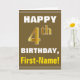 Ce simple design de carte de voeux sur le thème de l'anniversaire présente un voeu d'anniversaire chaleureux comme "HEUREUX 4ème anniversaire, prénom!" sur le devant, en texte gras sur un arrière - plan de couleur marron. Le numéro d'anniversaire a une apparence de coloration fausse/imitation or. Le nom sur le devant peut être customisé. L'intérieur comporte un message d'anniversaire qui peut être personnalisé. Une carte de voeux comme celle-ci pourrait être une façon amusante de transmettre des voeux d'anniversaire à quelqu'un qui célèbre son quatrième anniversaire. [~Z0000281]