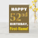 Ce simple design de carte de voeux sur le thème de l'anniversaire présente un voeu d'anniversaire chaleureux comme "HAPPY 52nd BIRTHDAY, First-Name!" sur le devant, en texte gras sur un arrière - plan de couleur marron. Le numéro d'anniversaire a un look de couleur imitation or. Le nom sur le devant peut être customisé. L'intérieur comporte un message d'anniversaire qui peut être personnalisé. Une carte de voeux comme celle-ci pourrait être une façon amusante d'offrir des voeux d'anniversaire à quelqu'un qui célèbre son cinquante-deuxième anniversaire. [~Z0000281]