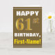 Ce simple design de carte de voeux sur le thème de l'anniversaire présente un voeu d'anniversaire chaleureux comme "HAPPY 61st BIRTHDAY, First-Name!" sur le devant, en texte gras sur un arrière - plan de couleur marron. Le numéro d'anniversaire a un look de couleur imitation or. Le nom sur le devant peut être customisé. L'intérieur comporte un message d'anniversaire qui peut être customisé. Une carte de voeux comme celle-ci pourrait être une façon amusante d'offrir des voeux d'anniversaire à quelqu'un qui célèbre son soixante et unième anniversaire. [~Z0000281]