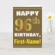 Ce simple design de carte de voeux sur le thème de l'anniversaire présente un voeu d'anniversaire chaleureux comme "HAPPY 96th BIRTHDAY, First-Name!" sur le devant, en texte gras sur un arrière - plan de couleur marron. Le numéro d'anniversaire a une apparence de coloration fausse/imitation or. Le nom sur le devant peut être personnalisé. L'intérieur comporte un message d'anniversaire qui peut être personnalisé. Une carte de voeux comme celle-ci pourrait être une façon amusante d'offrir des voeux d'anniversaire à quelqu'un qui célèbre son quatre-vingt-seize ans. [~Z0000281]