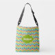 Sac fourre-tout Allover avec un motif rayé de chevron clair et audacieux orange, bleu aqua, marron, vert et blanc avec une bannière verte et une zone vous pouvez ajouter un nom pour personnaliser.