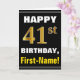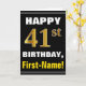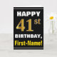 Ce simple design de carte de voeux sur le thème de l'anniversaire présente un voeu d'anniversaire chaleureux comme "HAPPY 41st BIRTHDAY, First-Name!" sur le devant, en texte gras sur un arrière - plan de couleur noire. Le numéro d'anniversaire a un look de couleur imitation or. Le nom sur le devant peut être customisé. L'intérieur comporte un message d'anniversaire personnalisable. Une carte de voeux comme celle-ci pourrait être une façon amusante d'offrir des voeux d'anniversaire à quelqu'un qui célèbre son quarante et unième anniversaire. [~Z0000275]
