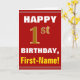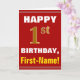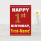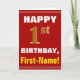 Cette simple carte de voeux d'anniversaire présente un souhait d'anniversaire chaleureux comme "HAPPY 1st BANTHDAY, First-Name!" sur le devant, en gras texte sur un arrière - plan de couleur rouge. Le numéro d'anniversaire a un look de couleur imitation or. Le nom sur le devant peut être customisé. L'intérieur comporte un message d'anniversaire qui peut être customisé. Une carte de voeux comme celle-ci pourrait être une façon amusante de transmettre des voeux d'anniversaire à quelqu'un qui célèbre son premier anniversaire. [~Z0000276]