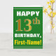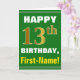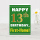 Ce simple design de carte de voeux sur le thème de l'anniversaire présente un voeu d'anniversaire chaleureux comme "HAPPY 13th BIRTHDAY, First-Name!" sur le devant, en texte gras sur un arrière - plan de couleur verte. Le numéro d'anniversaire a un look de couleur imitation or. Le nom sur le devant peut être customisé. L'intérieur comporte un message d'anniversaire qui peut être personnalisé. Une carte de voeux comme celle-ci pourrait être une façon amusante d'offrir des voeux d'anniversaire à quelqu'un qui célèbre son treizième anniversaire. [~Z0000279]