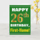 Ce simple design de carte de voeux sur le thème de l'anniversaire présente un voeu d'anniversaire chaleureux comme "HAPPY 26th BIRTHDAY, First-Name!" sur le devant, en texte gras sur un arrière - plan de couleur verte. Le numéro d'anniversaire a une apparence de coloration fausse/imitation or. Le nom sur le devant peut être personnalisé. L'intérieur comporte un message d'anniversaire personnalisable. Une carte de voeux comme celle-ci pourrait être une façon amusante de donner des voeux d'anniversaire à quelqu'un qui célèbre son vingt-sixième anniversaire. [~Z0000279]