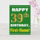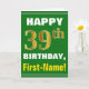 Ce simple design de carte de voeux sur le thème de l'anniversaire présente un voeu d'anniversaire chaleureux comme "HEUREUX 39ème anniversaire, prénom!" sur le devant, en texte gras sur un arrière - plan de couleur verte. Le numéro d'anniversaire a un look de couleur imitation or. Le nom sur le devant peut être customisé. L'intérieur comporte un message d'anniversaire qui peut être personnalisé. Une carte de voeux comme celle-ci pourrait être une façon amusante d'envoyer des voeux d'anniversaire à quelqu'un qui célèbre son trente-neuvième anniversaire. [~Z0000279]
