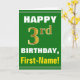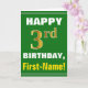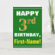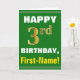 Ce simple design de carte de voeux sur le thème de l'anniversaire présente un voeu d'anniversaire chaleureux comme "HEUREUX 3ème anniversaire, prénom!" sur le devant, en texte gras sur un arrière - plan de couleur verte. Le numéro d'anniversaire a une apparence de coloration fausse/imitation or. Le nom sur le devant peut être customisé. L'intérieur comporte un message d'anniversaire qui peut être customisé. Une carte de voeux comme celle-ci pourrait être une façon amusante d'offrir des voeux d'anniversaire à quelqu'un qui célèbre son troisième anniversaire. [~Z0000279]