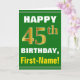 Ce simple design de carte de voeux sur le thème de l'anniversaire présente un voeu d'anniversaire chaleureux comme "HEUREUX 45ème anniversaire, prénom!" sur le devant, en texte gras sur un arrière - plan de couleur verte. Le numéro d'anniversaire a un look de couleur imitation or. Le nom sur le devant peut être customisé. L'intérieur comporte un message d'anniversaire personnalisable. Une carte de voeux comme celle-ci pourrait être une façon amusante d'offrir des voeux d'anniversaire à quelqu'un qui célèbre son quarante-cinquième anniversaire. [~Z0000279]