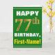 Ce simple design de carte de voeux sur le thème de l'anniversaire présente un voeu d'anniversaire chaleureux comme "HAPPY 77th BIRTHDAY, First-Name!" sur le devant, en texte gras sur un arrière - plan de couleur verte. Le numéro d'anniversaire a une apparence de coloration fausse/imitation or. Le nom sur le devant peut être personnalisé. L'intérieur comporte un message d'anniversaire qui peut être customisé. Une carte de voeux comme celle-ci pourrait être une façon amusante d'offrir des voeux d'anniversaire à quelqu'un qui célèbre son soixante-dix-septième anniversaire. [~Z0000279]