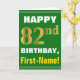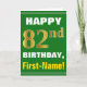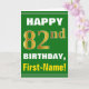Ce simple design de carte de voeux sur le thème de l'anniversaire présente un voeu d'anniversaire chaleureux comme "HAPPY 82nd BIRTHDAY, First-Name!" sur le devant, en texte gras sur un arrière - plan de couleur verte. Le numéro d'anniversaire a une apparence de coloration fausse/imitation or. Le nom sur le devant peut être customisé. L'intérieur comporte un message d'anniversaire qui peut être personnalisé. Une carte de voeux comme celle-ci pourrait être une façon amusante d'offrir des voeux d'anniversaire à quelqu'un qui célèbre son quatre-vingt-deuxième anniversaire. [~Z0000279]