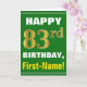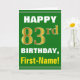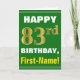 Ce simple design de carte de voeux sur le thème de l'anniversaire présente un voeu d'anniversaire chaleureux comme "HAPPY 83rd BIRTHDAY, First-Name!" sur le devant, en texte gras sur un arrière - plan de couleur verte. Le numéro d'anniversaire a une apparence de coloration fausse/imitation or. Le nom sur le devant peut être customisé. L'intérieur comporte un message d'anniversaire personnalisable. Une carte de voeux comme celle-ci pourrait être une façon amusante d'offrir des voeux d'anniversaire à quelqu'un qui célèbre son quatre-vingt-troisième anniversaire. [~Z0000279]