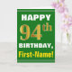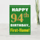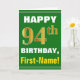Ce simple design de carte de voeux sur le thème de l'anniversaire présente un voeu d'anniversaire chaleureux comme "HAPPY 94th BIRTHDAY, First-Name!" sur le devant, en texte gras sur un arrière - plan de couleur verte. Le numéro d'anniversaire a un look de couleur imitation or. Le nom sur le devant peut être personnalisé. L'intérieur comporte un message d'anniversaire qui peut être customisé. Une carte de voeux comme celle-ci pourrait être une façon amusante d'offrir des voeux d'anniversaire à quelqu'un qui célèbre son quatre-vingt-quatorzième anniversaire. [~Z0000279]