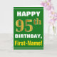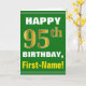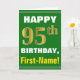 Ce simple design de carte de voeux sur le thème de l'anniversaire présente un voeu d'anniversaire chaleureux comme "HAPPY 95th BIRTHDAY, First-Name!" sur le devant, en texte gras sur un arrière - plan de couleur verte. Le numéro d'anniversaire a un look de couleur imitation or. Le nom sur le devant peut être customisé. L'intérieur comporte un message d'anniversaire personnalisable. Une carte de voeux comme celle-ci pourrait être une façon amusante d'offrir des voeux d'anniversaire à quelqu'un qui célèbre son quatre-vingt-quinzième anniversaire. [~Z0000279]